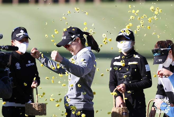 (서울=뉴스1) = 이정민이 17일 전북 익산CC에서 열린 '동부건설-한국토지신탁 챔피언십' 최종 라운드에서 우승을 확정 짓고 축하 받고 있다. (KLPGA 제공) 2021.10.17/뉴스1