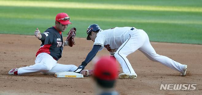 [서울=뉴시스] 이영환 기자 = 17일 오후 서울 송파구 잠실야구장에서 열린 2021 KBO리그 KIA 타이거즈와 두산 베어스의 더블헤더 1차전 경기, 7회말 1사 1루 두산 김재환 타석에서 1루주자 조수행이 2루 도루에 성공하고 있다. 2021.10.17. 20hwan@newsis.com