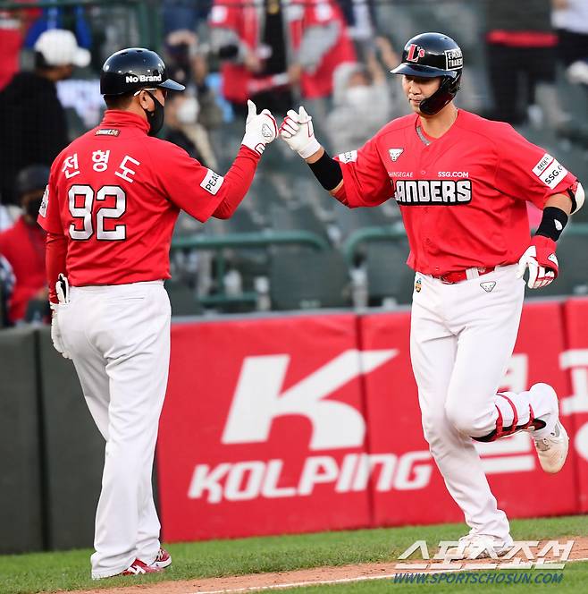 2021 KBO리그 롯데 자이언츠와 SSG랜더스의 DH1차전 경기가 17일 부산사직야구장에서 열렸다. SSG 이흥련이 9회초 2사 1루에서 좌월 투런홈런을 치고 그라운드를 돌고 있다. 부산=최문영 기자 deer@sportschosun.com /2021.10.17/
