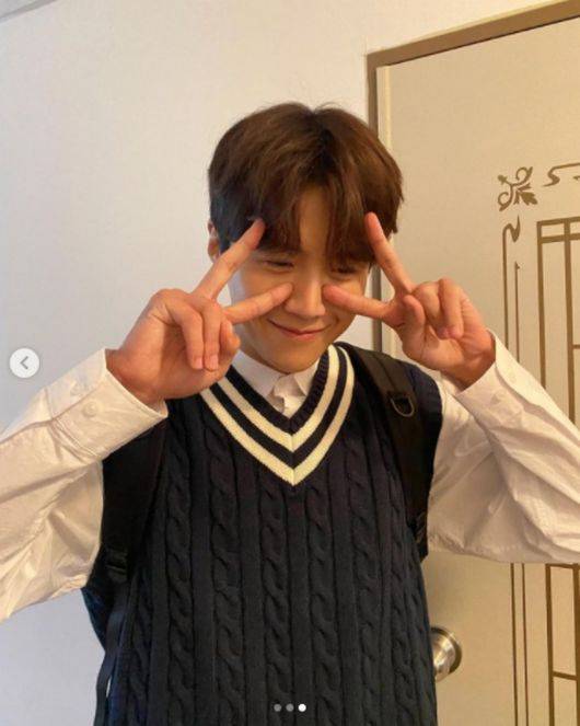 대학생 시절로 돌아가 풋풋한 비주얼을 자랑하고 있는 김선호는 수줍게 미소를 짓고 있다.