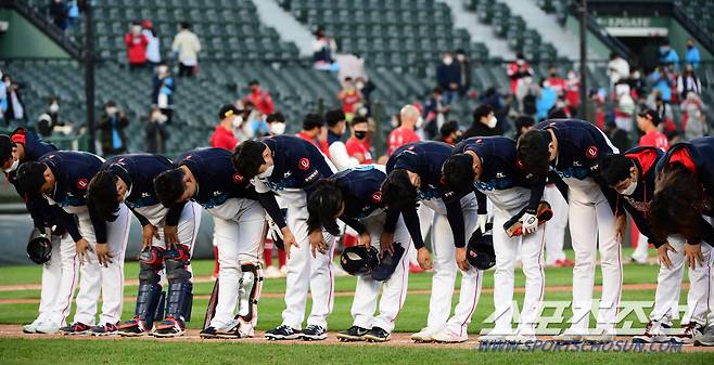 2021 KBO리그 롯데 자이언츠와 SSG랜더스의 DH1차전 경기가 17일 부산사직야구장에서 열렸다. 롯데 선수들이 SSG에 4대14 대패를 거두고 관중들에게 답례하고 있다. 부산=최문영 기자 deer@sportschosun.com /2021.10.17/