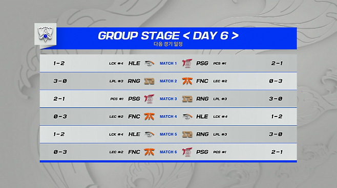 로얄 네버 기브업(RNG)이 3전 전승, PSG 탈론이 2승 1패로 나란히 1, 2위를 차지한 가운데 LCK 대표팀 중 하나인 한화생명e스포츠가 1승 2패로 3위에 랭크됐다.