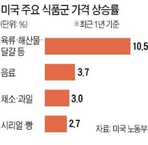 16일(현지시간) 미국 노동부에 따르면 최근 1년 동안 가정식품지수(food at home index)는 4.5% 뛰었다. 가정식품지수는 육류, 해산물, 유제품, 채소와 과일, 빵과 시리얼, 음료 등 미국인이 가정에서 많이 먹는 식품 가격을 반영해 산출한다.