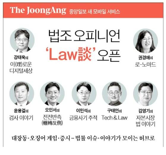 중앙일보는 법률 전문가 칼럼 ‘로담(Law談)’을 10월 18일 시작합니다(joongang.co.kr/series/11492). 로담은 법조계뿐 아니라 법에 관심이 있는 독자에게 새로운 관점과 알찬 정보를 제공하는 법률 전문 오피니언 공간입니다.