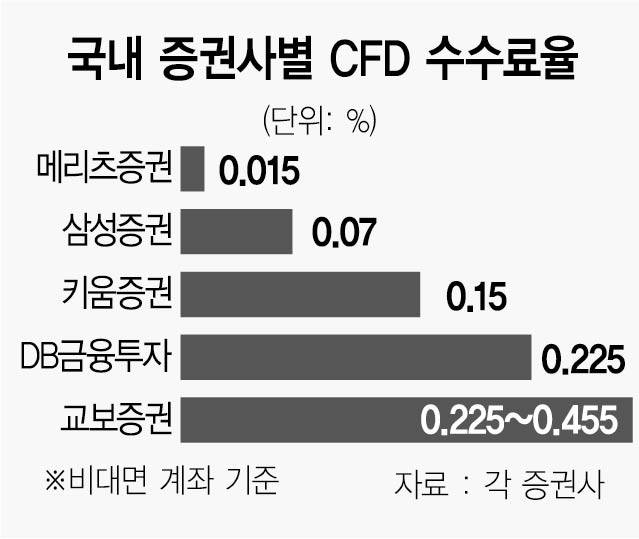 17일 증권가에 따르면 메리츠증권은 지난 15일 비대면 계좌의 차액결제거래(CFD) 수수료를 기존 0.10%에서 0.015%로 대폭 내렸다. 업계 최저 수준의 수수료를 무기로 개인 전문 투자자 시장 공략에 나선 것이다.