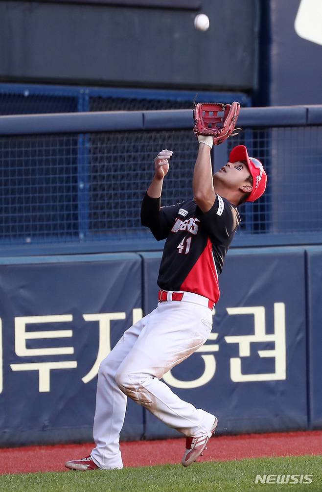 [서울=뉴시스] 이영환 기자 = 17일 오후 서울 송파구 잠실야구장에서 열린 2021 KBO리그 KIA 타이거즈와 두산 베어스의 더블헤더 1차전 경기, 7회말 2사2루에서 KIA 3루수 최정용이 두산 김인태의 파울 타구를 잡아내고 있다. 2021.10.17. 20hwan@newsis.com