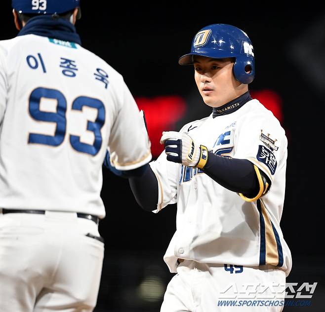 2021 KBO리그 LG 트윈스와 NC 다이노스의 더블헤더 2차전 경기가 17일 창원NC파크에서 열렸다. 2회말 NC 강진성이 안타를 치고 기쁨을 나누고 있다. 창원=허상욱 기자 wook@sportschosun.com/2021.10.17/