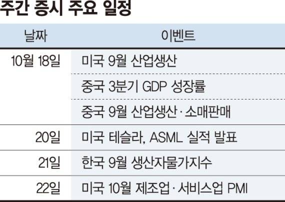 이번 주엔 중국의 3·4분기 국내총생산(GDP) 성장률 발표가 예정돼 있다. 증권가에서는 성장률이 전년 대비 5% 수준에 그칠 것으로 보고 있다. 코로나19발 충격이 있었던 지난해 1·4분기~3·4분기를 제외할 경우 공식 집계가 시작된 이래 분기 기준 가장 낮은 수준이다.