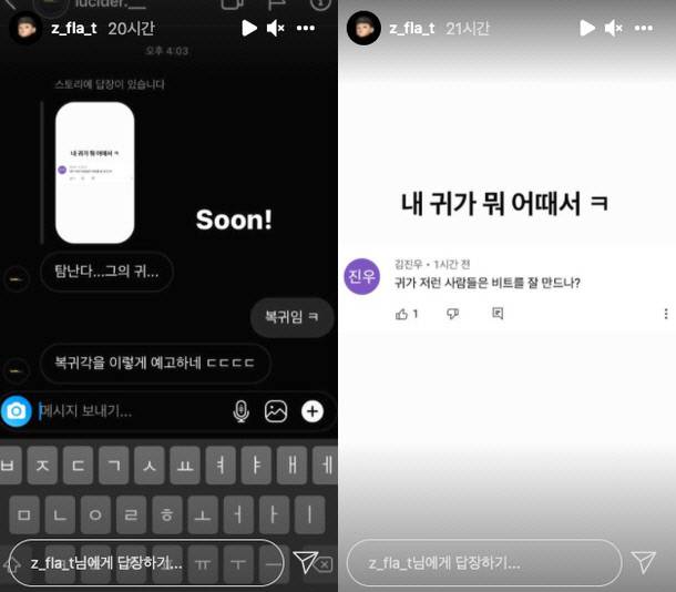 지플랫은 16일 자신의 SNS인스타그램 스토리에 “귀가 저런 사람들은 비트를 잘 만드나?”라는 내용의 댓글을 박제했다. 그리고는 “내 귀가 뭐 어때서ㅋ”라는 댓글로 응수했다.