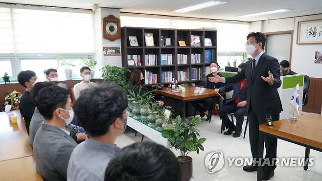 (서울=연합뉴스) 국민의힘 유승민 대선 경선 후보가 17일 부산 북강서을 당원협의회를 방문, 인사말을 하고 있다. 2021.10.17 [유승민 캠프 제공. 재판매 및 DB 금지]