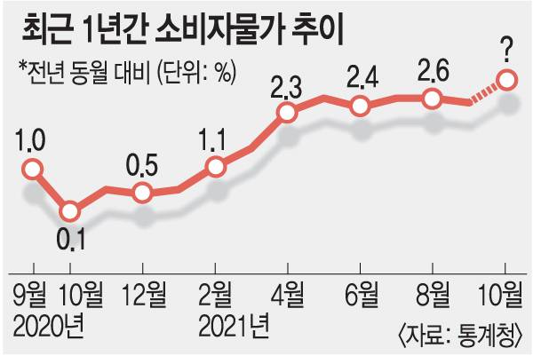 10년만에 3%대 물가 오나10월 물가상승률이 3%를 넘어서면 2012년 2월(3.0%) 이후 10년 만에 '3% 물가시대'가 도래한다.