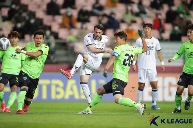 울산은 17일 오후 7시 전주월드컵경기장에서 열린 전북과의 2021년 아시아챔피언스리그(ACL) 8강에서 전반 13분만에 선제골을 폭발했다.