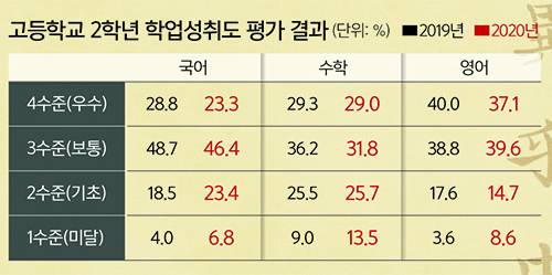 이번 조사에서 상위권 학생은 줄었고 하위권 학생은 늘었다. 전반적으로 성취도가 낮아졌다는 의미다. 지난해 고2 학생들의 4수준 비율은 과목별로 국어 23.3%, 수학 29.0%, 영어 37.1%로 나타났다. 이는 1년 전보다 각각 5.5%포인트, 0.3%포인트, 2.9%포인트 하락한 수치다. 하위권 학생들도 마찬가지다. 기초학력미달 비율은 국어 6.8%, 수학 13.5%, 영어 8.6%로, 2019년 국어 4.0%, 수학 9.0%, 영어 3.6%와 비교해 각각 2.8%포인트, 4.5%포인트, 5.0%포인트씩 모두 늘어났다. 이는 2010년 이후 최고 수준이다.