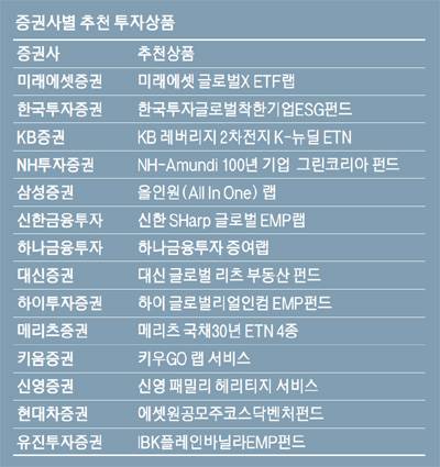 메리츠증권은 금리 방향에 따른 채권가격 움직임에 대응할 수 있도록 국고채30년물에 투자하는 ETN 4개 종목을 새로 상장시켰다. 국채 가격 상승에 베팅하는 '메리츠 국채30년 ETN' '메리츠 레버리지 국채30년 ETN'과 국채 가격 하락으로 수익을 얻는 '메리츠 인버스 국채30년 ETN' '메리츠 인버스2X 국채30년 ETN' 등이다. 유진투자증권이 추천한 'IBK플레인바닐라EMP증권'은 전통적인 자산배분 방식인 주식 60%, 채권 40% 비중으로 담는 전략을 사용한다. 고배당주, 하이일드채권, 성장주 등에 골고루 투자하면서 변동성 목표를 6% 이내로 가져가 안정적이다. 지난해 주린이가 아무 주식이나 사도 오르는 장세였다면 올해부턴 전문가가 수익을 가져가는 시장으로 탈바꿈하면서 전문가에게 일임하는 방법도 각광받고 있다.