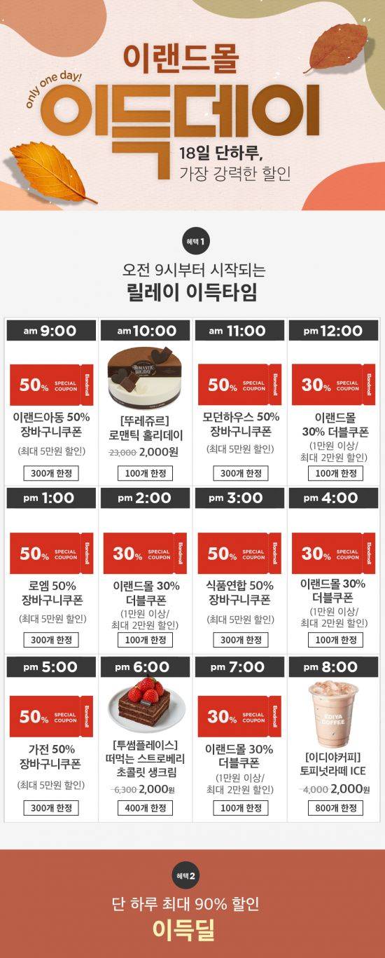 이랜드몰은 10월 이득데이를 통해 인기 브랜드 할인 쿠폰과 특가 상품, 장바구니 쿠폰 등을 선착순으로 제공하는 '릴레이 이득타임'과 최대 90% 할인된 가격에 인기 상품을 제공한다.