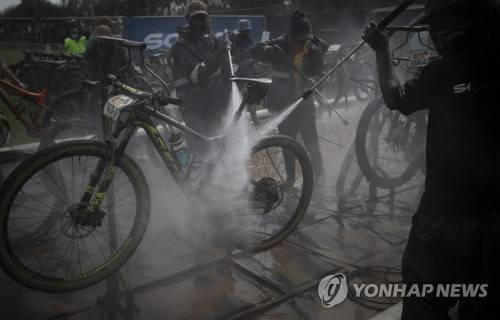 epa09528271 Rider bicycles are cleaned of the mud by cleaners at the end of the Prolog of the 2021 Absa Cape Epic mountain bike stage race held on Table Mountain, Cape Town, South Africa, 17 October 2021. This years event sees 600 riders tackle 620 kilometres over 8 days of riding and 15 350 metres of vertical ascent. The race includes UCI pro riders and amateur's in what is seen by many as the premier MTB stage race in the world. EPA/KIM LUDBROOK