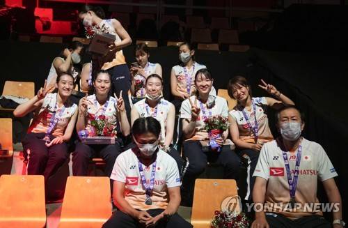 epa09528262 Players from Japan pose with their silver medals after the Uber Cup Badminton final tie between Japan and China in Aarhus, Denmark, 17 October 2021. EPA/CLAUS FISKER DENMARK OUT