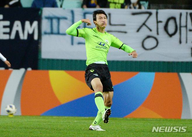 [전주=뉴시스] 김얼 기자 = 아시아축구연맹 챔피언스리그(ACL) 8강전 전북현대모터스와 울산현대의 경기가 열린 17일 전북 전주시 전주월드컵경기장에서 전북현대모터스 한교원 선수가 골을 성공시키고 세리머니를 하고 있다. 2021.010.17. pmkeul@newsis.com
