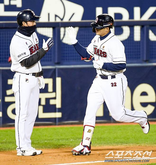 2021 KBO리그 두산 베어스와 KIA 타이거즈의 더블헤더 2차전이 17일 잠실구장에서 열렸다. 6회말 무사 1,2루 두산 김재환이 역전 스리런포를 날린 뒤 고영민 코치와 하이파이브를 나누고 있다. 잠실=박재만 기자 pjm@sportschosun.com/2021.10.17/