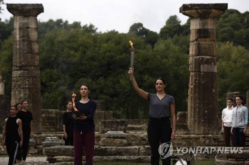 epa09528352 Greek actress Xanthi Georgiou (C-R), playing the role of High Priestess, lights the flame during the rehearsal of the Olympic flame lighting ceremony for the Beijing 2022 Winter Olympics, at the Ancient Olympia site, in southern Greece, 17 October 2021. EPA/YANNIS KOLESIDIS