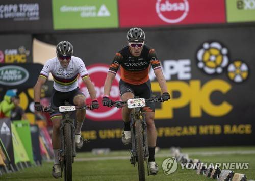 epa09528388 Team Canyon Northwave MTB's Martin Stoöek (R) of the Czech Republic and Andreas Seewald (L) of Germany finish the Prolog of the 2021 Absa Cape Epic mountain bike stage race held on Table Mountain, Cape Town, South Africa, 17 October 2021. This years event sees 600 riders tackle 620 kilometres over 8 days of riding and 15 350 metres of vertical ascent. The race includes UCI pro riders and amateur's in what is seen by many as the premier MTB stage race in the world. EPA/KIM LUDBROOK