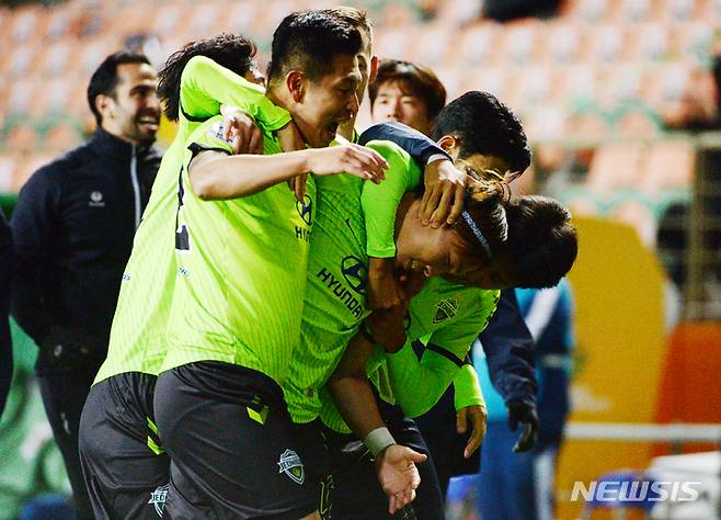 [전주=뉴시스] 김얼 기자 = 아시아축구연맹 챔피언스리그(ACL) 8강전 전북현대모터스와 울산현대의 경기가 열린 17일 전북 전주시 전주월드컵경기장에서 전북현대모터스 쿠니모토 선수가 골을 성공시키고 동료들에게 축하를 받고 있다. 2021.10.17. pmkeul@newsis.com