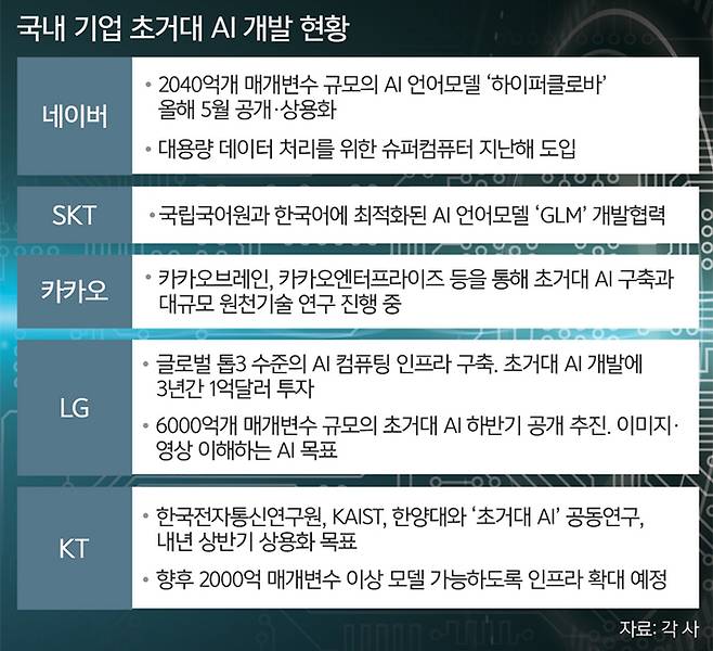 세계적으로 초거대 AI 개발 경쟁이 거세지고 있다. 국내 기업도 ‘AI 주권’ 확보를 위해 속속 가세하고 있다. 지난 5월 네이버가 하이퍼클로바를 내놓은 것을 시작으로 LG, 카카오, 통신3사 등이 AI 지능 높이기 경쟁에 뛰어들었다.