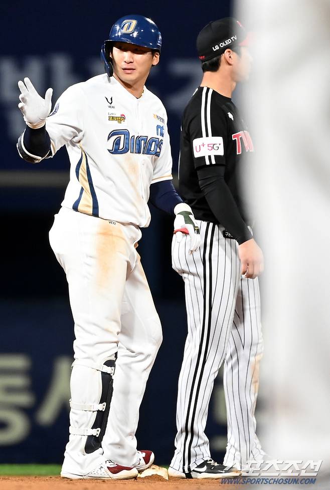 2021 KBO리그 LG 트윈스와 NC 다이노스의 더블헤더 2차전 경기가 17일 창원NC파크에서 열렸다. 9회말 2사 NC 나성범이 2루타를 치고 타임을 외치고 있다. 창원=허상욱 기자 wook@sportschosun.com/2021.10.17/