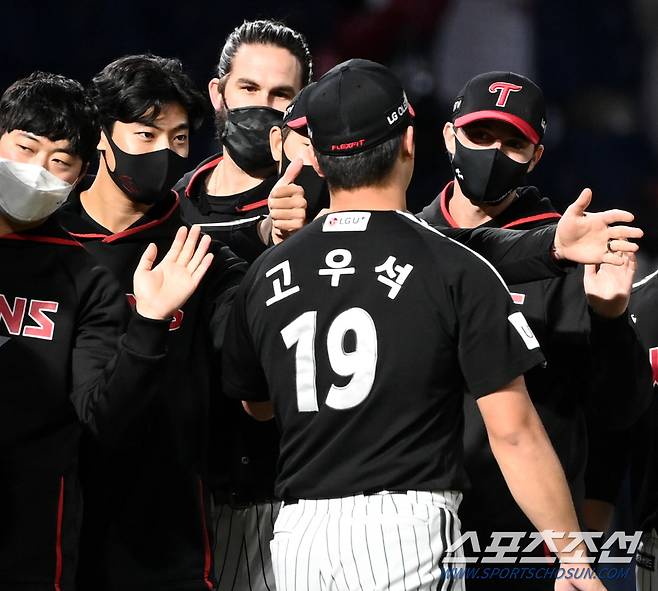 2021 KBO리그 LG 트윈스와 NC 다이노스의 더블헤더 2차전 경기가 17일 창원NC파크에서 열렸다. LG가 1-0으로 승리하며 더블헤더 2경기를 모두 승리했다. 경기 종료 후 기쁨을 나누는 LG 선수들의 모습. 창원=허상욱 기자 wook@sportschosun.com/2021.10.17/