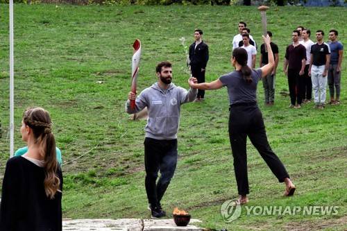 epa09528419 Greek actress Xanthi Georgiou (R), playing the role of High Priestess, passes the Olympic Flame to the first torchbearer, Greek Alpine Ski athelete Ioannis Antoiou (L), during the rehearsal of the Olympic flame lighting ceremony for the Beijing 2022 Winter Olympics, at the Ancient Olympia site, in southern Greece, 17 October 2021. EPA/VASSILIS PSOMAS