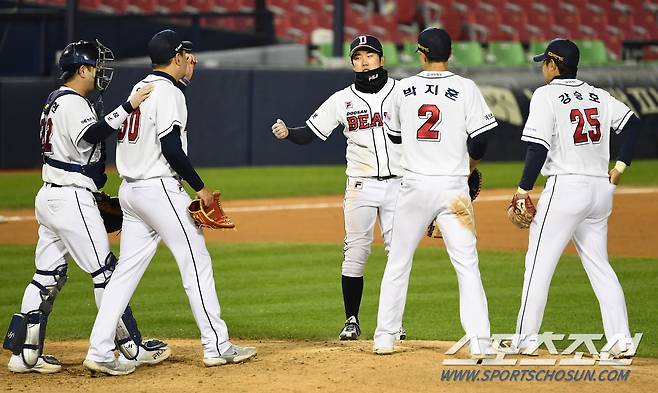 2021 KBO리그 두산 베어스와 KIA 타이거즈의 더블헤더 2차전이 17일 잠실구장에서 열렸다. 경기에서 승리한 두산 선수들이 기뻐하고 있다. 잠실=박재만 기자 pjm@sportschosun.com/2021.10.17/