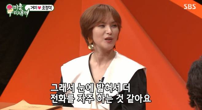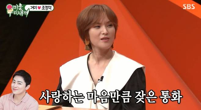 그도 그럴 게 조정석은 연예계 소문난 사랑꾼. 신동엽은 “얼마 전 조정석이 우리 집에 놀러왔는데 느낌상 한 두 시간에 한 번꼴로 거미에게 전화를 하더라”며 관련 사연을 전했다.