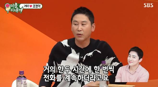 신동엽은 "얼마 전 조정석이 우리 집에 놀러왔는데 느낌상 한 두 시간에 한 번꼴로 거미에게 전화를 하더라"며 관련 사연을 전했다.