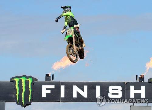 epa09528431 Austrian rider Timo Scharinger competes in men's MXGP category of Spain Motocross GP race in the town of Arroyomolinos, central Spain, 17 October 2021. EPA/Victor Lerena
