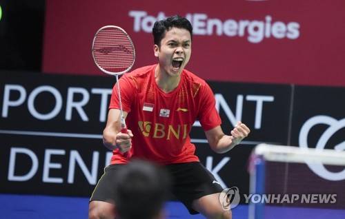 epa09528434 Indonesia's Anthony Sinisuka Ginting celebrates after winning his singles match in the badminton Thomas Cup final tie between China and Indonesia, in Aarhus, Denmark, 17 October 2021. EPA/Claus Fisker DENMARK OUT
