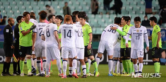 [전주=뉴시스] 김얼 기자 = 아시아축구연맹 챔피언스리그(ACL) 8강전 전북현대모터스와 울산현대의 경기가 열린 17일 전북 전주시 전주월드컵경기장에서 경기를 마친 선수들이 인사를 나누고 있다. 2021.10.17. pmkeul@newsis.com