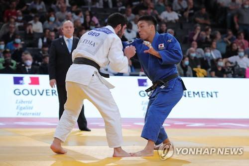 epa09528452 Sotaro Fujiwara (blue) of Japan in action during the men's -81kg category semi final match against Tato Grigalashvili(white) of Georgia at the Paris Grand Slam judo tournament, in Paris, France, 17 October 2021. EPA/CHRISTOPHE PETIT TESSON