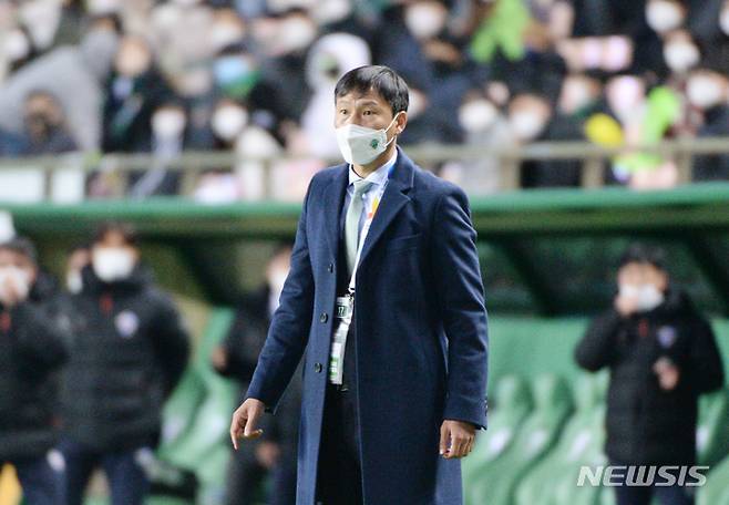 [전주=뉴시스] 김얼 기자 = 아시아축구연맹 챔피언스리그(ACL) 8강전 전북현대모터스와 울산현대의 경기가 열린 17일 전북 전주시 전주월드컵경기장에서 전북현대모터흐 김상식 감독이 경기를 바라보고 있다. 2021.10.17. pmkeul@newsis.com