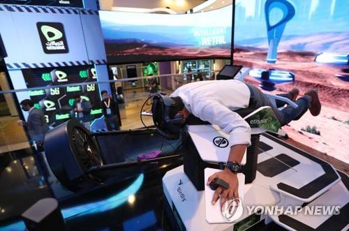 epa09528472 A visitor tests a 'Birdly' device at the Etisalat Group section of the Gulf Information Technology Exhibition (GITEX) Global 2021 in the Gulf emirate of Dubai, United Arab Emirates, 17 October 2021. The 41st edition of the annual GITEX Global runs 17 to 21 October 2021 and showcases hundreds of IT companies. EPA/ALI HAIDER