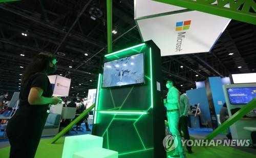 epa09528524 The Microsoft booth at the Gulf Information Technology Exhibition (GITEX) Global 2021 in the Gulf emirate of Dubai, United Arab Emirates, 17 October 2021. The 41st edition of the annual GITEX Global runs 17 to 21 October 2021 and showcases hundreds of IT companies. EPA/ALI HAIDER