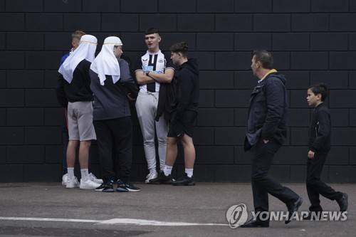 Newcastle fans chat outside the ground before an English Premier League soccer match between Newcastle and Tottenham Hotspur at St. James' Park in Newcastle, England, Sunday Oct. 17, 2021. Newcastle plays its first game under new ownership after the club was bought out last week by Saudi Arabia's sovereign wealth fund. (AP Photo/Jon Super)