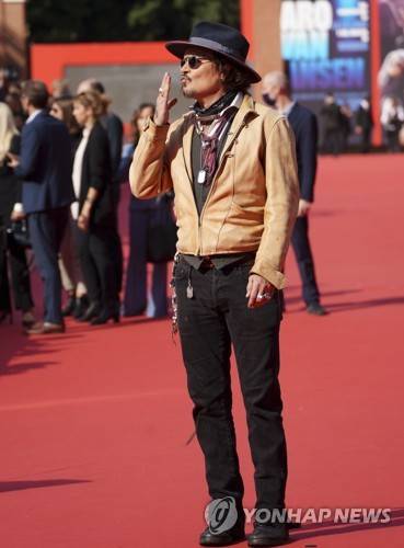 Actor Johnny Depp poses on the red carpet for the movie 'Puffins' at the 16th edition of the Rome Film Fest in Rome, Sunday, Oct. 17, 2021. (AP Photo/Domenico Stinellis)