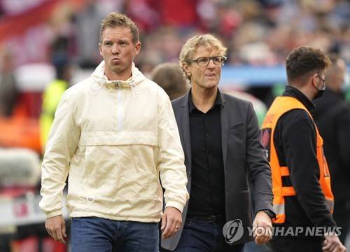 Bayern's head coach Julian Nagelsmann, left, ahead the German Bundesliga soccer match between Bayer Leverkusen and Bayern Munich in Leverkusen, Germany, Sunday, Oct. 17, 2021. (AP Photo/Martin Meissner) The deutsche fussball liga dfl does not allow the images to be used as sequences to emulate video.