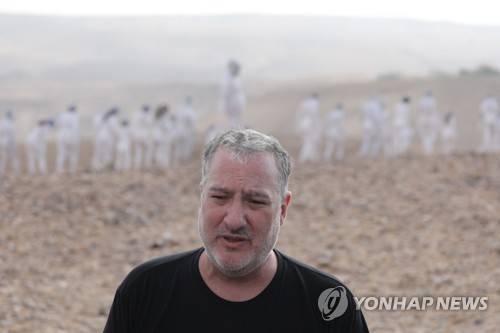 epa09528544 US artist Spencer Tunick speaks with media members during his nude photo installation overlooking the Dead Sea near the southern city of Arad, Israel, 17 October 2021. Some 300 participants took part in the nude photo installation aimed to raise awareness to the importance of preserving and restoring the Dead Sea. EPA/ABIR SULTAN EDITORIAL USE ONLY