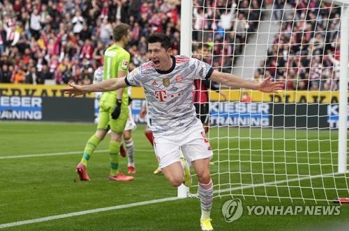 Bayern's Robert Lewandowski celebrates after scoring the opening goal during the German Bundesliga soccer match between Bayer Leverkusen and Bayern Munich in Leverkusen, Germany, Sunday, Oct. 17, 2021. (AP Photo/Martin Meissner) The deutsche fussball liga dfl does not allow the images to be used as sequences to emulate video.