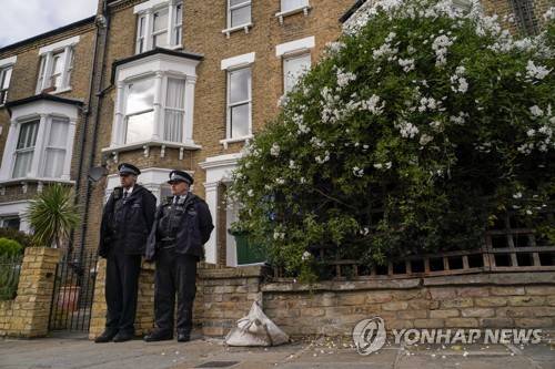 Police officers stand outside a house in north London, thought to be in relation to the death of Conservative MP Sir David Amess, Sunday, Oct. 17, 2021. Leaders from across Britain's political spectrum have come together to pay tribute to a long-serving British lawmaker who was stabbed to death in what police have described as a terrorist attack. (AP Photo/Alberto Pezzali)