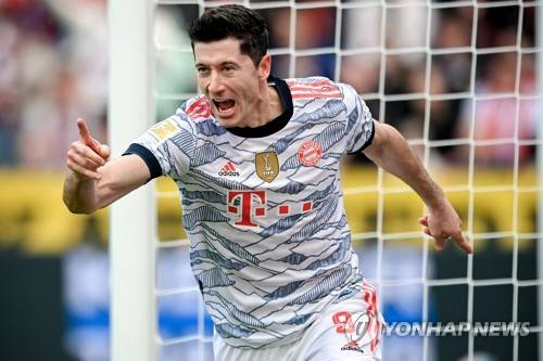 epa09528574 Bayern's Robert Lewandowski celebrates after scoring the 1-0 lead during the German Bundesliga soccer match between Bayer Leverkusen and FC Bayern Muenchen at BayArena in Leverkusen, Germany, 17 October 2021. EPA/SASCHA STEINBACH CONDITIONS - ATTENTION: The DFL regulations prohibit any use of photographs as image sequences and/or quasi-video.