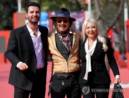 epa09528576 US actor Johnny Depp (C) with producer Andrea Jervolino (L) and Monica Bacardi (R) arrive for the screening of 'Puffins' at the 16th annual Rome International Film Festival, in Rome, Italy, 17 October 2021. The Festa Del Cinema Di Roma runs from 14 to 24 October. EPA/ETTORE FERRARI