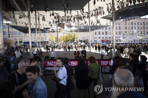 People gather under the Vieux Port Pavillion in Marseille to commemorate the 60th anniversary of the 1961 massacre of Algerians in Paris, Sunday, Oct. 17, 2021. A tribute march was organized on Sunday in Paris for the 60th anniversary of the bloody police crackdown on a protest by Algerians in the French capital, during the final year of their country's independence war with its colonial power. (AP Photo/Daniel Cole)