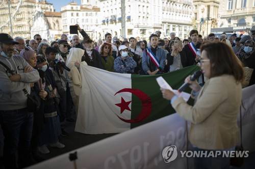 People gather during a demonstration Marseille to commemorate the 60th anniversary of the 1961 massacre of Algerians in Paris, Sunday, Oct. 17, 2021. A tribute march was organized on Sunday in Paris for the 60th anniversary of the bloody police crackdown on a protest by Algerians in the French capital, during the final year of their country's independence war with its colonial power. (AP Photo/Daniel Cole)